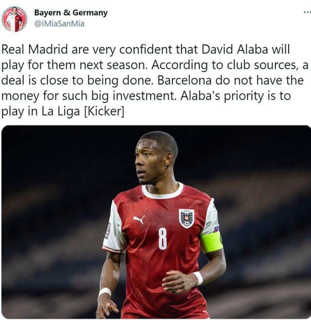 《踢球者》表示,皇马对于免签阿拉巴非常有信心,现在交易已经接近完成。巴萨此前也对阿拉巴表现出了兴趣,但他们没有足够的资金去完成这笔签约,而球员的首选是前往西甲踢球。