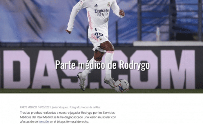 直播车3月17日讯 ,皇马官网发布消息:经医疗团队诊断,罗德里戈右股二头肌肌腱肌肉受伤。随后官方又删除了这条消息。