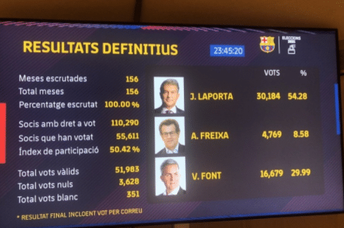 来源:直播车03-08 11:09直播车讯 北京时间3月8日,巴萨大选正式落幕,投票的结果也已经出炉,巴萨官方宣布,最终拉波尔塔击败弗雷夏和冯特,当选巴萨新一届主席,拉波尔塔时隔11年再度执掌俱乐部,此前他是2003年当选为巴萨主席,2010年离任,期间缔造了巴萨梦二、梦三王朝。同时拉波尔塔这也是巴萨121年队史的第42位主席,恭喜。