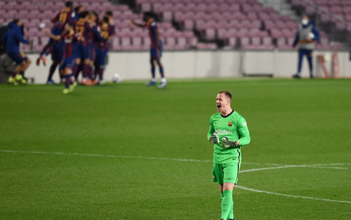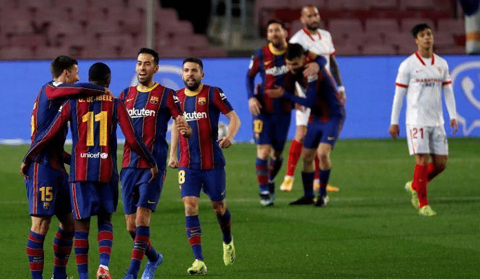 来源:直播车03-04 19:48直播车3月4日讯 国王杯半决赛次回合巴萨上演神奇逆转,他们在主场通过加时赛以3-0击败塞维利亚,总分3-2逆转对手,挺进到了本赛季国王杯决赛。这场比赛巴萨赢得非常惊险,登贝莱早早取得进球,但塞维利亚获得点球,好在特尔施特根神奇扑点成功,如果点球打进的话,巴萨需要再进3球才行。接下来神剧情出现,常规时间内第93分08秒,皮克进球扳平比分,比赛进入到加时赛。加时赛布莱斯维特头球为巴萨反超,巴萨顶住压力,成功晋级到国王杯决赛。