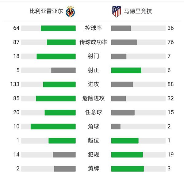 最终全场比赛结束,马竞客场2-0战胜比利亚雷亚尔,床单军团终结各项赛事3场不胜。