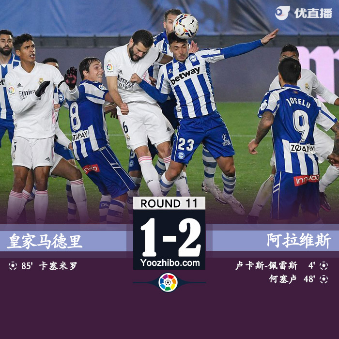 北京时间11月29日凌晨4:00直播车讯,2020-2021赛季西甲联赛第11轮继续进行,皇马主场迎战来访的阿拉维斯。上半时比赛纳乔送点,卢卡斯-佩雷斯点射一蹴而就,随后库尔图瓦拒单刀,阿扎尔因伤退场。下半时比赛库尔图瓦低级失误送何塞卢破门,卡塞米罗终场前为皇马追回一球。最终,皇马主场1-2不敌阿拉维斯,遭遇联赛三轮不胜。