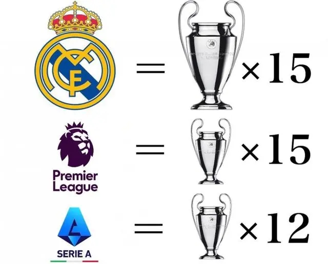 直播车讯 皇马和五大联赛欧冠数对比:皇马15座与英超相同。