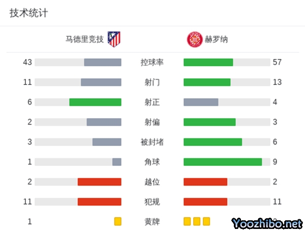 第38分钟,赫罗纳门将加扎尼加禁区外手球,主裁手下留情仅出示黄牌警告,马竞获得位置极佳的定位球机会,格列兹曼主罚直入死角得分,马竞1-0领先。