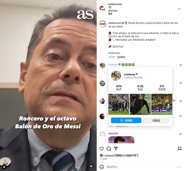 来源:直播车11-01 11:32直播车11月01日阿根廷巨星梅西获得生涯第8座金球奖,尽管大多数人都向他表达了祝贺和致敬,但也有一些不认可的声音。北京时间10月31日,西班牙知名媒体《阿斯报》主编龙赛罗,就录制视频嘲讽梅西的世界杯和第8座金球,而他的言论竟然得到了C罗的认可和评论。