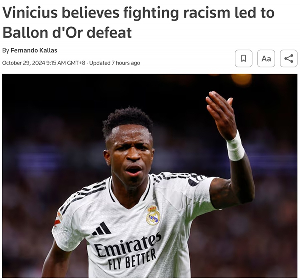 来源:直播车10-30 15:58直播车讯北京时间10月29日,来自权威外媒路透社的消息,刚无缘金球奖的皇马射手维尼修斯再次发声,他自认为打击种族歧视的激进主义,直接导致了自己无缘金球奖。