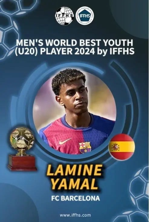 直播车讯权威数据统计机构IFFHS在官网宣布,巴萨17岁新星亚马尔获得2024年IFFHS世界最佳青年 (U20) 男子球员奖项。
