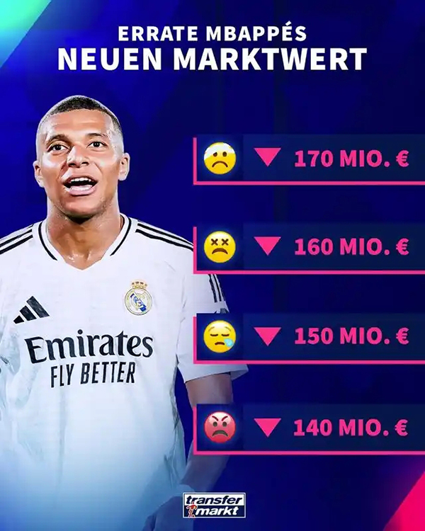 德转给出了1.7亿、1.6亿、1.5亿和1.4亿四个数字,这也意味着现身价1.8亿欧的姆巴佩在此次更新中,身价必定会出现下跌。这也是姆巴佩自加盟皇马后,身价首次出现变动。