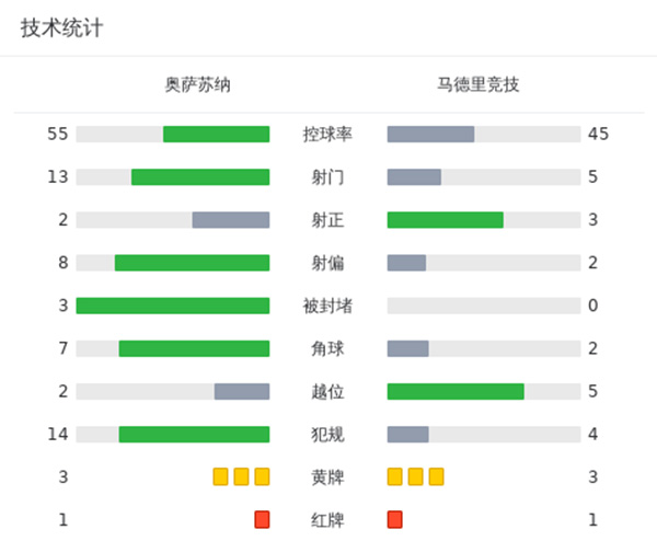 马竞2-0奥萨苏纳 格子连场破门里克尔梅建功莫拉塔染红