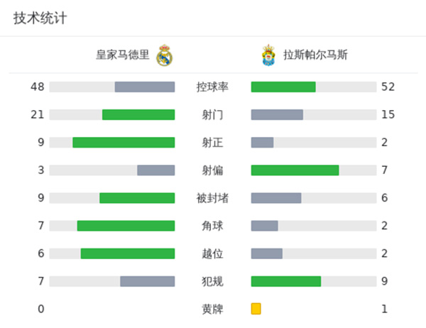 第45+3分钟,皇马角球机会,第一点被解围,外围巴斯克斯得球送出传中,迪亚斯点球点附近攻门得手,皇马1-0拉斯帕尔马斯。