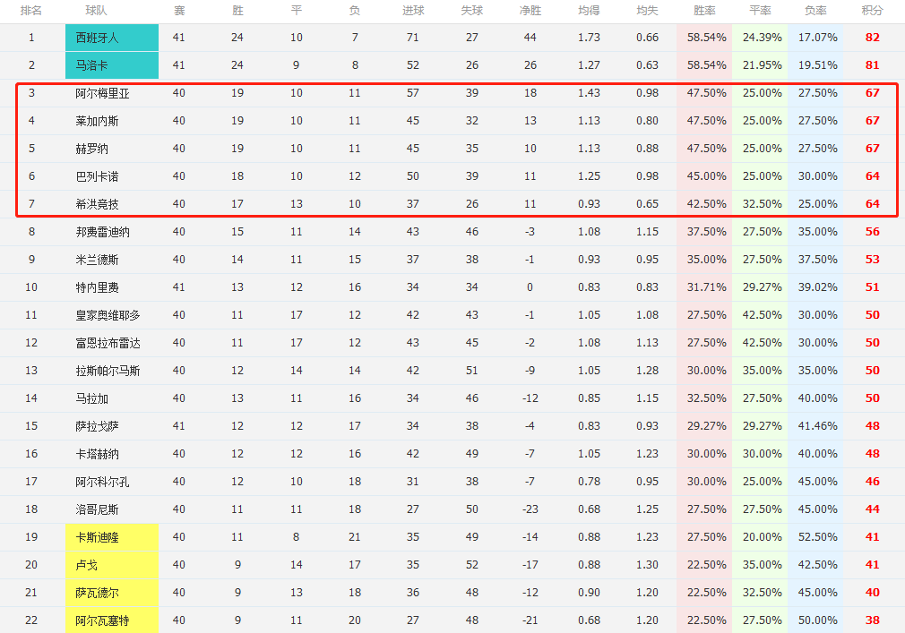 来源:直播车05-24 18:06直播车讯 西乙联赛已经诞生了2个直接升甲球队,分别是西班牙人和马略卡,两队拿到了新赛季西甲的参赛资格,剩下的一个名额将由第三四五六名通过附加赛产生。目前5队在竞争附加赛区的4个名额,分别是第三名的阿尔梅里亚(67分)、第四名的莱加内斯(67分)、第五名的赫罗纳(67分)、第六名的巴列卡诺(64分)、第七名的希洪竞技(64分),五队的第41轮比赛还未开打,竞争形势可以说相当混乱,争六悬念巨大。