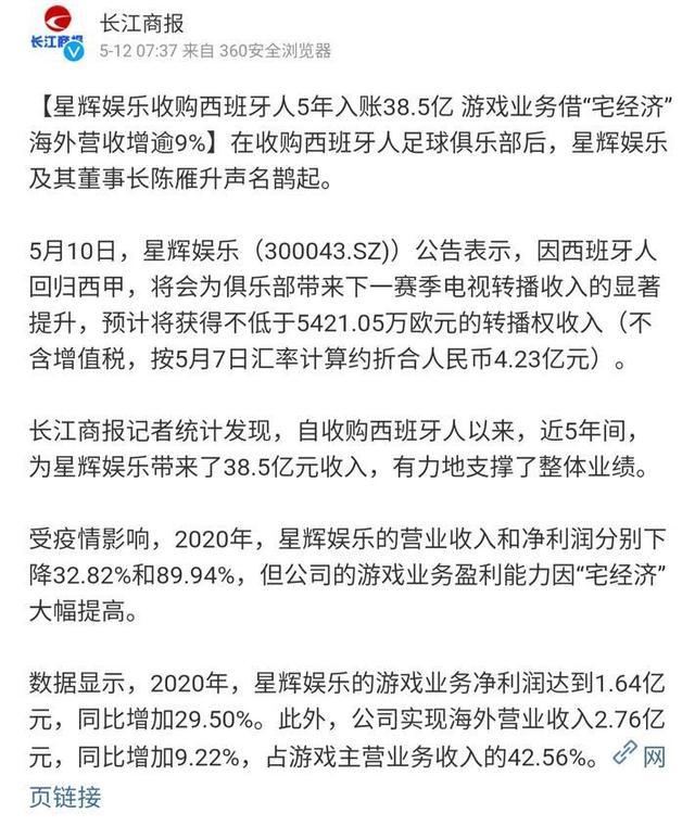 在过去的几年,西班牙人的状态如何呢?从西班牙人球队提供的2016-2019年的财务报表显示,这几年西班牙人的营业收入为4.81亿、5.95亿、8.62亿、12.12亿,根据《长江商报》的报道,在过去的5年中,但凭着收购西班牙,陈雁升已经为自己的公司带来了38.5亿的收入。