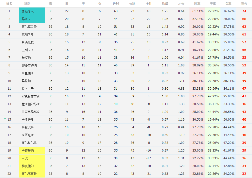 随着阿尔梅里亚的雪崩,西乙积分榜也出现了明显断层,直接冲甲区和附加赛冲甲区划开了较大的界限,西班牙人和马略卡基本锁定直接升甲,马略卡本轮获胜的话,也将领先阿尔梅里亚达到近10分。接下来的悬念是西乙冠军,以及附加赛4支球队,第5名的希洪竞技和第6名的巴列卡诺开始受到了第七八名球队的威胁,形成了6支球队争夺4个附加赛名额的局面。