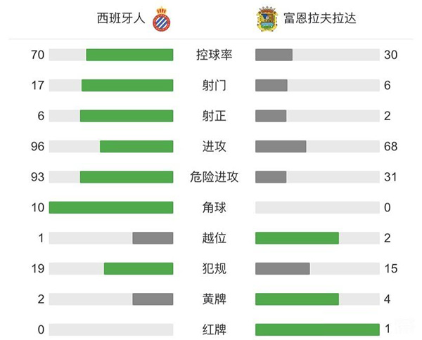 全场比赛结束,西班牙人4-0击败富恩拉布雷达。