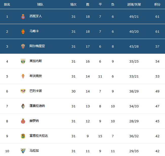 来源:直播车03-30 19:27直播车3月30日讯2021年3月底,西乙联赛已经完成了第31轮的所有比赛,积分榜形势突变,最近一度跌出积分榜前二即直接冲甲区的西班牙人意外逆袭重夺榜首位置,这种逆袭一方面是西班牙人自身近期的两连胜,一方面则是西班牙人4大冲甲死敌的雪崩间接保送西班牙人夺取榜首。