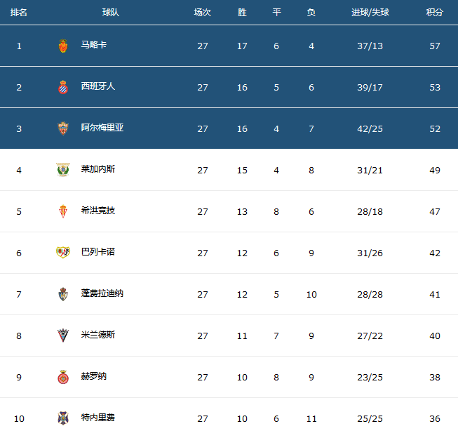 来源:直播车03-02 15:39直播车3月2日讯 北京时间3月2日,西乙联赛已经结束了第27轮的争夺,27轮过后,西乙积分榜彻底变天,马略卡逐渐形成了一骑绝尘之势,意外逆袭成为了西乙第一冲甲大热,本轮以1-0战胜洛格罗涅斯之后拿到了57个联赛积分,领先第二名的西班牙人4分;西班牙人53分暂列第二名,本轮爆冷被希洪竞技1-1逼平;第三名的阿尔梅里亚本轮4-1大胜卢戈,拿到了52分,仅仅比西班牙人少1个积分。