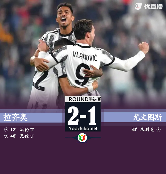 直播车讯:北京时间4月24日意大利杯 半决赛次回合,拉齐奥主场对阵尤文图斯。上半场卡斯特利亚诺斯头球破门,弗拉霍维奇禁区打门被扑,佩林扑单刀,下半场卡斯特利亚诺斯梅开二度,米利克推射空门得分。两回合总比分尤文3-2淘汰拉齐奥晋级决赛。