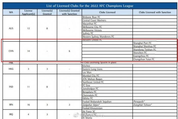 亚足联公布了2022年亚冠牌照名单,中国队只有6支球队获得了新赛季的亚冠联赛牌照,分别是上海海港、上海申花、山东泰山、深圳、广州和长春亚泰。6支球队里,有5支都是中超第一阶段两个赛区的前三名,只有苏州赛区第三名北京国安未获牌照。北京国安在今年亚冠比赛期间受疫情影响滞留海外5个月,昨日才全部回国。唯一一个获得牌照且不在赛区前三名的球队是中超老字号上海申花。