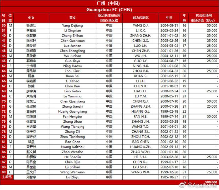 直播车讯德转中国区管理员朱艺昨日公布了广州队的亚冠小组赛大名单,由U22全华班组成,其中还包括6名U17球员。
