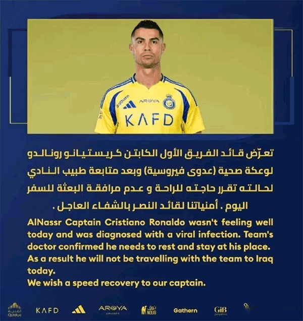 16日,C罗突然摊牌官宣了决定,这是啥情况呢?按照预期,C罗将跟随球队出征亚冠客场对阵巴格达男足的比赛,不过在赛前C罗因为被诊断出感染病毒,虽然C罗本人很想要出战,但是队医给C罗的建议是休息治疗,毕竟C罗已经是一个39岁的老将,他的身体由不得他太多的韧性,在综合考虑后,因为身体不适的症状并没有得到太多的缓解,C罗最终官宣决定,那就是退出亚冠对阵巴格达的比赛,C罗并不会跟随利雅得胜利队前往客场备战和比赛。