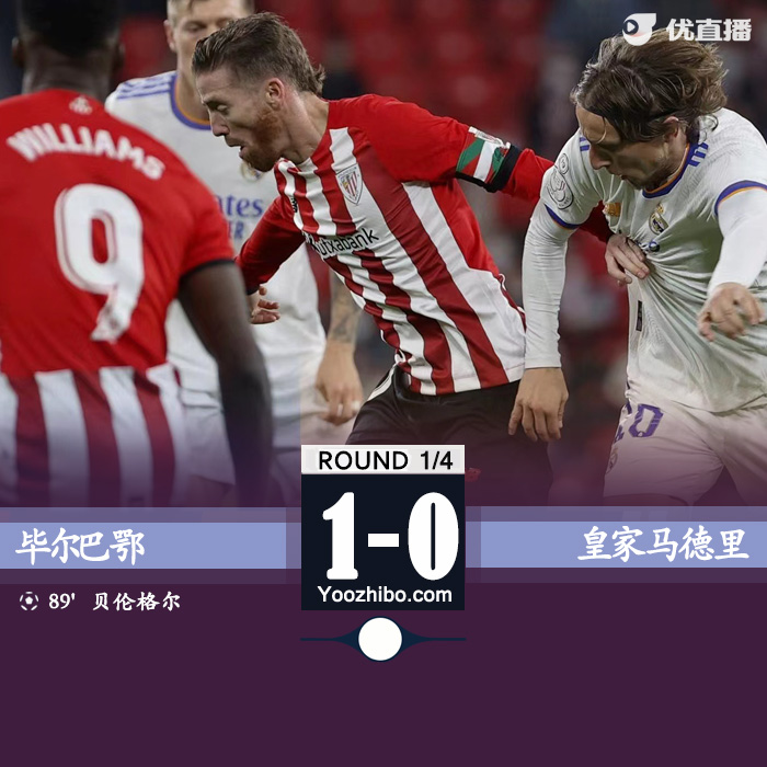 直播车2月4日讯 北京时间2月4日凌晨4点30分,2021-22赛季西班牙国王杯1/4决赛在圣马梅斯球场展开角逐,皇家马德里客场挑战毕尔巴鄂竞技。上半场双方均无建树,下半场卡塞米罗失良机,皇马后场连续失误致丢球,贝伦格尔绝杀。最终皇家马德里客场0-1负于毕尔巴鄂竞技,皇马无缘国王杯四强。