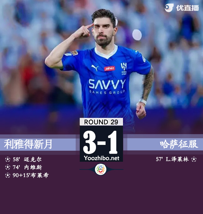直播车讯:北京时间4月26日晚23时整,2023-24赛季沙特联第29轮展开角逐,利雅得新月坐镇主场迎战哈萨征服,上半场新月仅1脚射正,下半场泽拉拉扬打破僵局,迈克尔闪电扳平,内维斯点射反超,布莱希补时第15分钟破门。最终利雅得新月主场3-1逆转哈萨征服,积分榜方面,新月联赛28轮保持不败,联赛剩6轮以12分优势领跑。