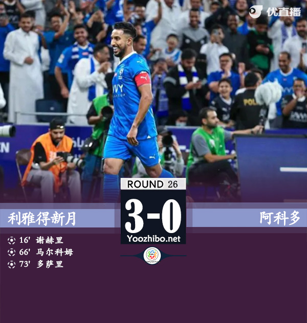 直播车讯:北京时间4月3日03:00,沙特联赛第26轮利雅得新月迎战阿科多的比赛,上半场内维斯助攻谢赫里头球破门,科利亚多失单刀,下半场达瓦萨里助攻马尔科姆单刀破门,内维斯助攻多萨里推射扩大比分,最终利雅得新月3-0阿科多豪取31连胜12分领跑。