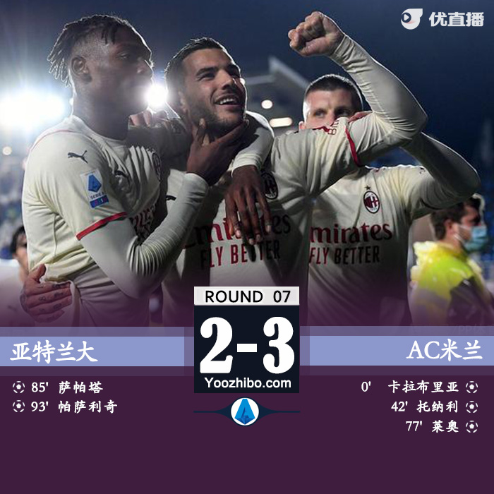直播车10月4日讯 北京时间10月04日星期一02:45,意甲第7轮亚特兰大对阵AC米兰。上半场,卡拉布里亚开场28秒超级闪击,托纳利破门,迈尼昂频频救险,AC米兰半场2-0领先亚特兰大。下半场,特奥奔袭助攻,莱奥破门,梅西亚斯手球被判罚点球,萨帕塔点射扳回一城,帕萨利奇补时再入一球。最终,AC米兰客场3-2战胜亚特兰大,红黑军团升至联赛第二。