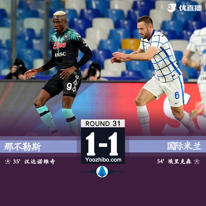 直播车4月19日讯 北京时间4月19日凌晨2点45分,2020-21赛季意甲第31轮焦点战在马拉多纳球场展开角逐,那不勒斯坐镇主场迎战国际米兰。上半场卢卡库两次中框,汉达诺维奇乌龙球,下半场埃里克森远射扳平,波利塔诺中框。最终国际米兰客场1-1战平那不勒斯,国米联赛11连胜遭终结。积分榜方面,国米积75分以9分优势领跑,那不勒斯积60分位居第5名。