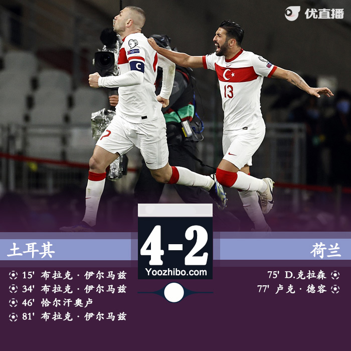 直播车3月25日讯 北京时间3月25日1点,世预赛欧洲赛区G组荷兰客场对阵土耳其。上半场,伊尔马兹先是远射破门,随后他又打进点球,德里赫特头球中柱。下半场,恰尔汗奥卢轰进世界波,克拉森和卢克德容替补登场后在两分钟内连追两球,伊尔马兹任意球直接破门完成帽子戏法同时为土耳其锁定胜局,补时阶段卡巴克送点,恰基尔将点球扑出,全场比赛结束,土耳其4-2荷兰。