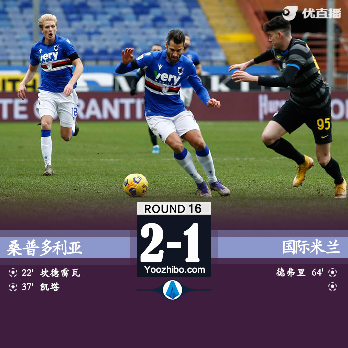 直播车1月6日讯 北京时间1月6日22:00,意甲联赛第16轮一场比赛在桑普多利亚和国际米兰之间进行。上半场桑切斯点球被扑阿什利扬补射中柱,托内利头球中框坎德雷瓦点球破僵,达姆斯高精彩突破助攻凯塔破门。下半场德弗里扳回一球。最终国米客场1-2不敌桑普联赛八连胜遭终结,在积分榜继续落后AC米兰1分排名次席。
