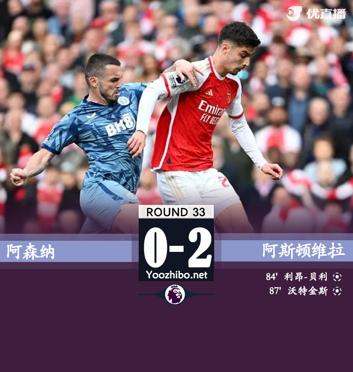 直播车讯:北京时间4月14日,英超联赛第33轮,阿森纳主场迎战阿斯顿维拉。上半场,哈弗茨打门被马丁内斯挡出,萨卡小角度爆射击中边网,沃特金斯断球低射中柱,特罗萨德近距离打门被马丁内斯神勇化解,萨卡内切兜射稍偏;下半场,蒂勒曼斯远射击中横梁后反弹中柱,热苏斯推射被扑,迪涅横传助攻贝利后点包抄破门打破僵局,若日尼奥传球失误后沃特金斯接长传单刀挑射入网。最终比分为阿森纳0-2阿斯顿维拉。