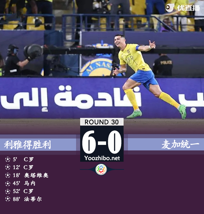 直播车讯:北京时间5月5日凌晨2时,沙特联第30轮,利雅得胜利主场对阵麦加统一。上半场,C罗八分钟内连入两球上演梅开二度,马内助攻奥塔维奥破门扩大比分优势,尾声阶段,奥塔维奥助攻马内再入一球。半场战罢,利雅得胜利暂4-0麦加统一;下半场,马内助攻C罗再入一球完成帽子戏法,法蒂尔最后时刻补射破门。全场比赛结束,利雅得胜利6-0麦加统一!
