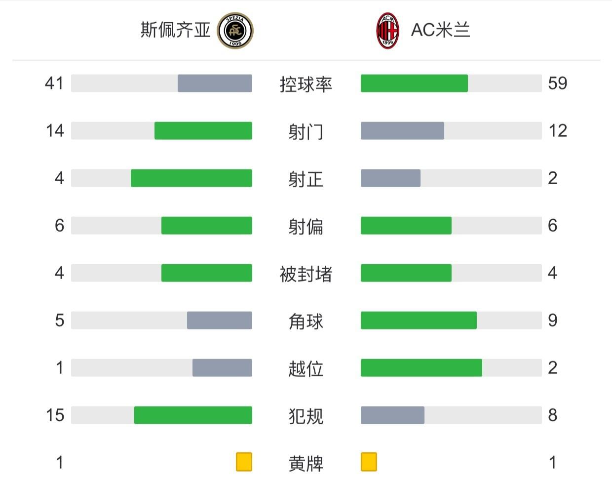 全场比赛结束,米兰客场0-2不敌斯佩齐