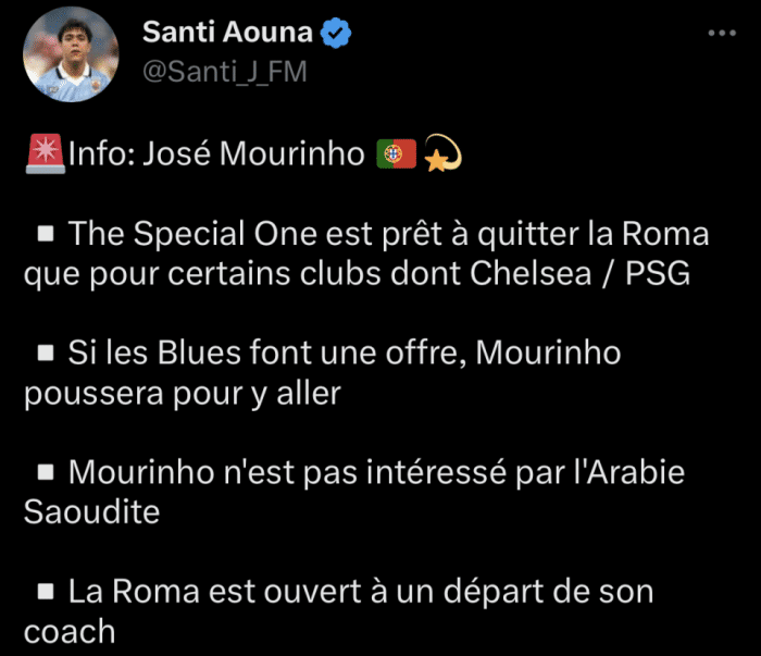 来源:直播车04-13 16:38直播车04月13日讯 ,来自自法国媒体Foot Mercato记者桑蒂-阿乌纳的透露,穆里尼奥已经准备好离开罗马,但他明确拒绝了沙特豪门利雅得胜利队的邀约,他只会为包括切尔西或巴黎圣日耳曼这样的欧洲豪门俱乐部离开。
