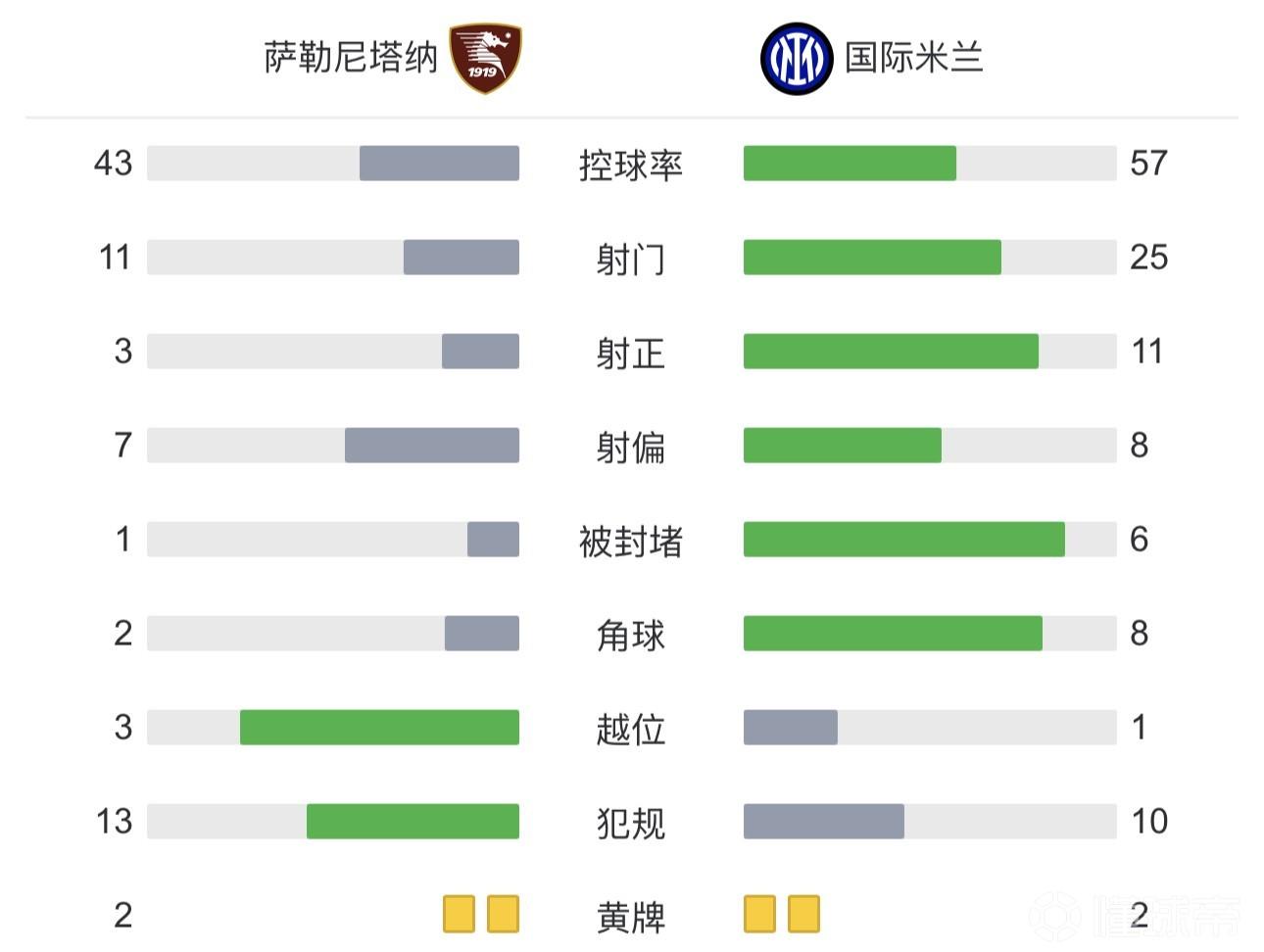 第6分钟,国米首开记录!卢卡库接长传头球摆渡戈森斯插上中路弧顶凌空打门球进,萨勒尼塔纳0-1国米。