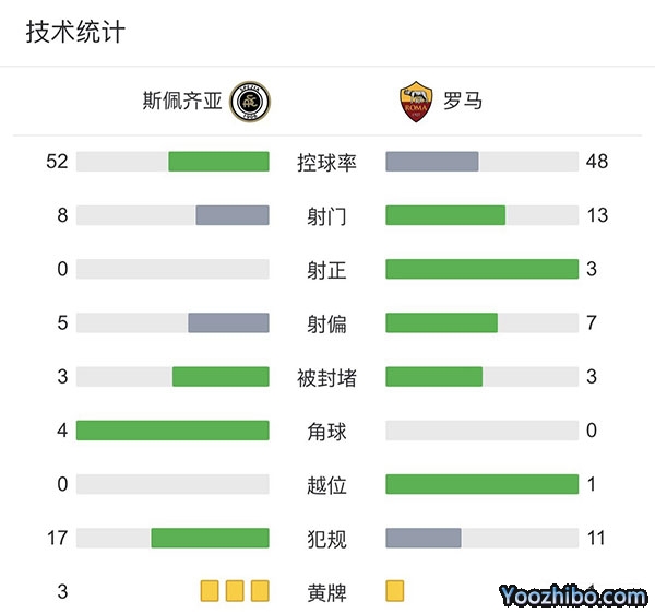 全场比赛结束,最终罗马2-0斯佩齐亚。