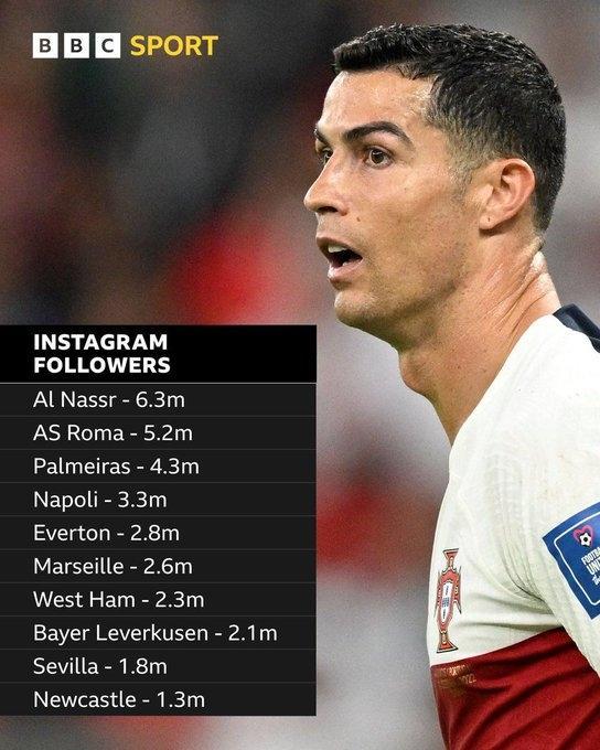 BBC:利雅得胜利签下C罗后粉丝暴涨,超过罗马