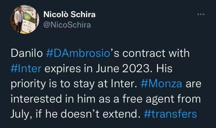 丹布罗西奥与国米的合同在2023年6月到期,他的首选依然是留在国米。蒙扎对他很感兴趣,并且希望在明年7月将其免签。