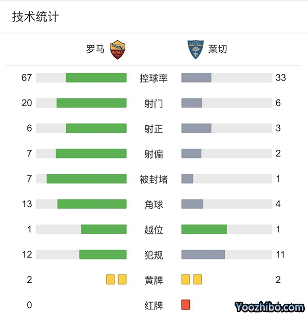全场结束,罗马2-1击败莱切。