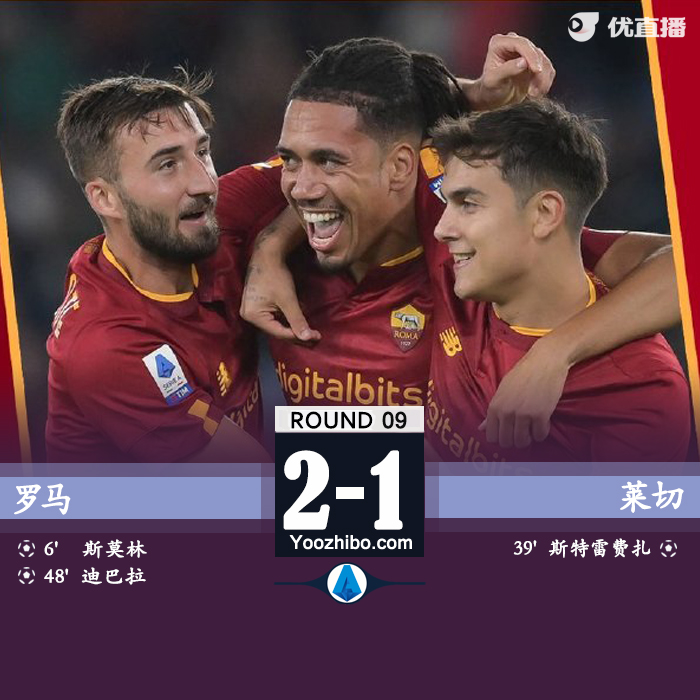 罗马2-1莱切 斯莫林连场破门迪巴拉点射后伤退