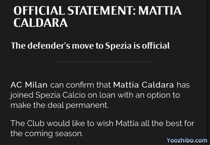 直播车07月18日讯 AC米兰官方消息,球队后卫卡尔达拉租借加盟斯佩齐亚,租期一年。