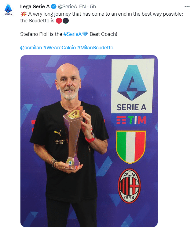 直播车05月23日讯 意甲官方消息,AC米兰主帅皮奥利当选意甲赛季最佳主帅。