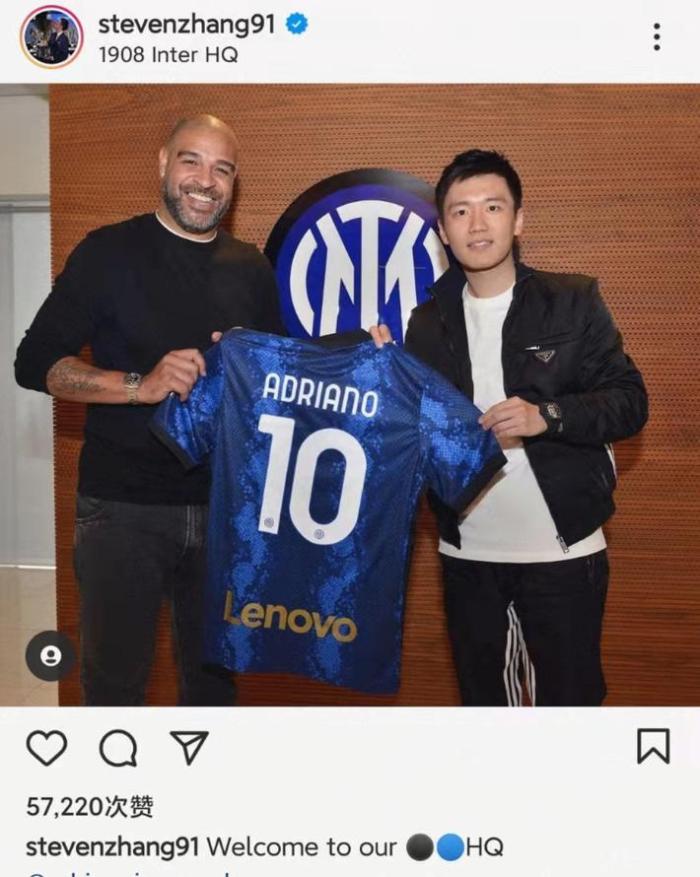 直播车04月22日讯 北京时间今天,国米主席张康阳今天在社交媒体上晒出了与国米名宿阿德里亚诺的合照。