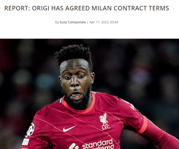 奥里吉与利物浦的合同将在今夏到期,他将不会续约,并自由转会加盟红黑军团。