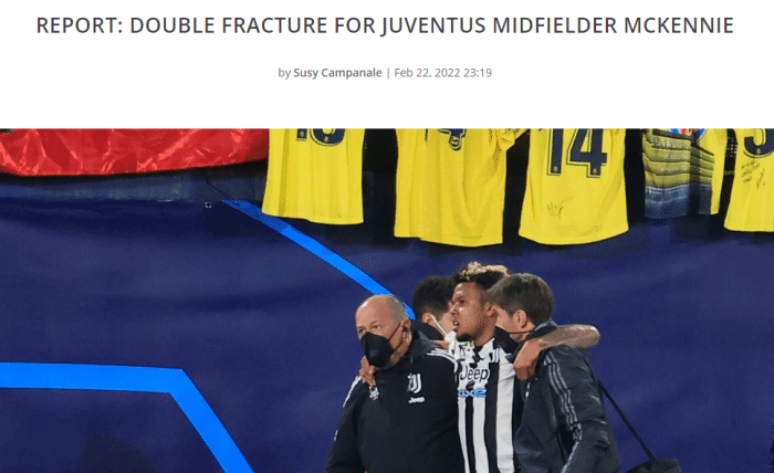 在今天凌晨尤文1-1战平比利亚雷亚尔的欧冠1/8决赛首回合比赛中,麦肯尼在比赛第80分钟因伤下场。