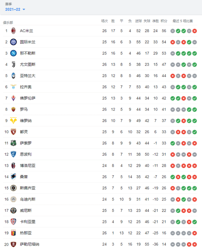 米兰本轮作客副班长萨勒尼塔纳被2-2逼平,现在他们26轮56分排名第一,国米则在输球后少赛一轮54分排名第二。