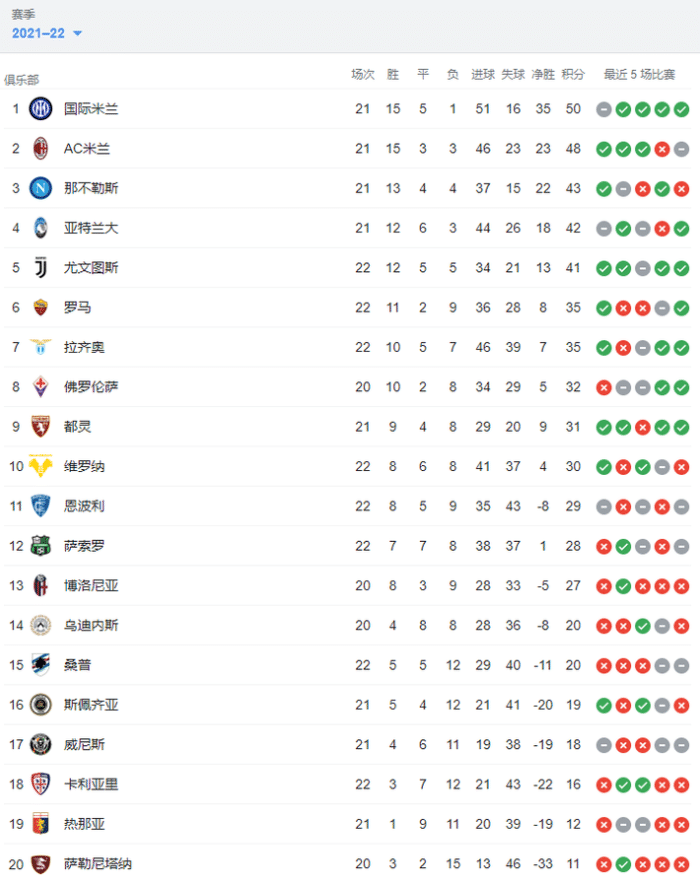 国米22轮过后拿到了50分排名第一,同城死敌AC米兰48分排名第二,那不勒斯43分排名第三,亚特兰大42分排名第四。