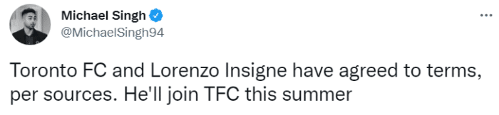 来源:直播车12-30 09:45直播车12月30日讯 据美职联记者MichaelSingh报道,那不勒斯队长因西涅已经和美职联球队多伦多FC达成个人协议,明年夏天自由身加盟。