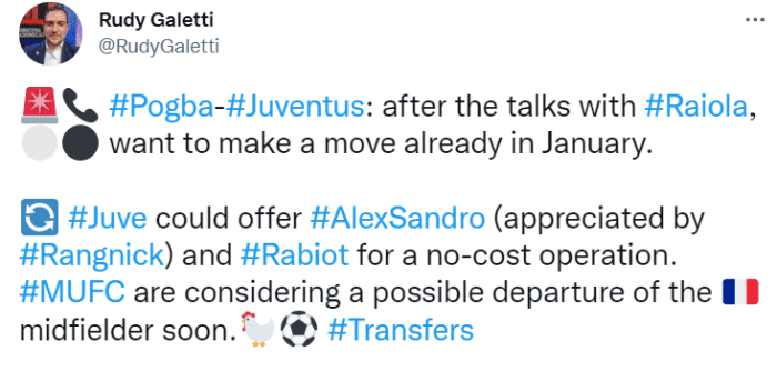 该记者表示,在和拉伊奥拉谈话后,尤文有意在1月签回博格巴。